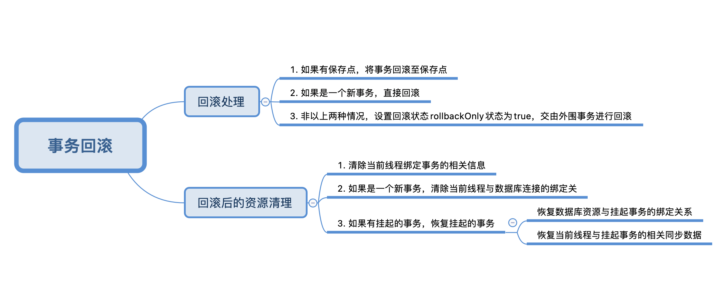 在事务回滚之后,需要清理相关的资源以及恢复被挂起的事务: