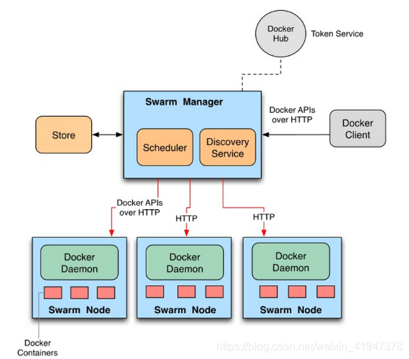 每台服务器上都装有Docker并且开启了基于HTTP的DockerAPI。这个集群中有一个SwarmManager的管理者,用来管理集群中的容器资源。管理者的管理对象不是服务器层面而是集群层面的,也就是说通过Manager,我们只能笼统地向集群发出指令而不能具体到某台具体的服务器上要干什么(这也是Swarm的根本所在)。至于具体的管理实现方式,Manager向外暴露了一个HTTP接口,外部用户通过这个HTTP接口来实现对集群的管理。