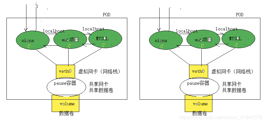 POD中所有容器和pause容器会共享 这个虚拟网卡、和数据卷