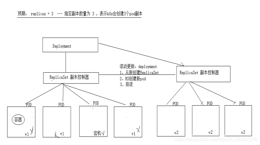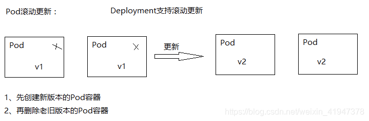 Deployment不仅仅可以滚动更新,而且可以进行回滚,如果发现升级到V2版本后,发现服务不可用,可以回滚到V1版本。