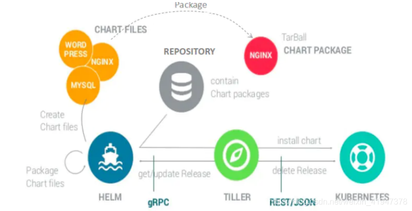 - helm 客户端指定的 chart 结构和 values 信息通过 gRPC 传递给 Tiller