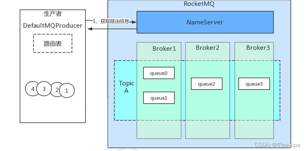 注意了,这里我们发现,有可能在实际的生产过程中,我们的 RocketMQ 有几台服务器构成的集群。其中有可能是一个主题 TopicA 中的 4 个队列分散在 Broker1、Broker2、Broker3 服务器上。