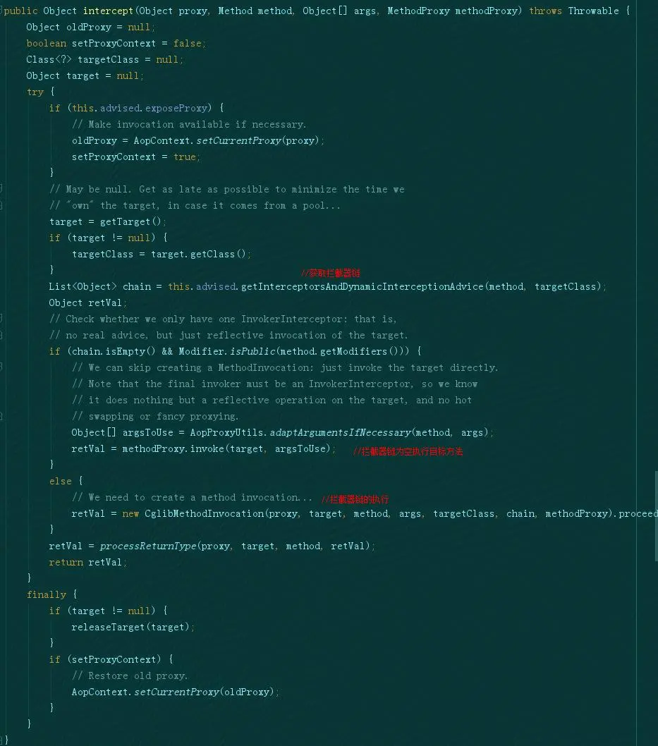 第51行~第56行的代码,如果拦截器列表不为空,按照注释的意思,需要一个ReflectiveMethodInvocation,并通过proceed方法对原方法进行拦截,proceed方法感兴趣的朋友可以去看一下,里面使用到了递归的思想对chain中的Object进行了层层的调用。