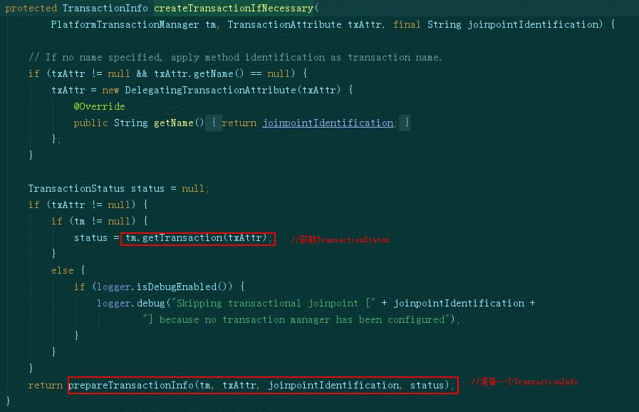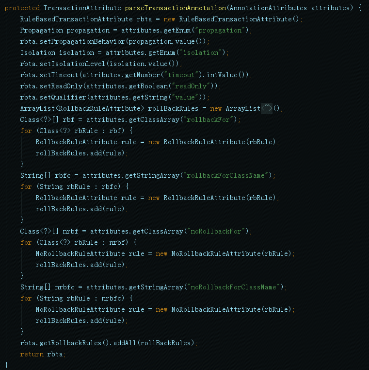 在这个方法中我们看到了在Transactional注解中声明的各种常用或者不常用的属性的解析,至此,事务的初始化工作算是完成了,下面开始真正的进入执行阶段。