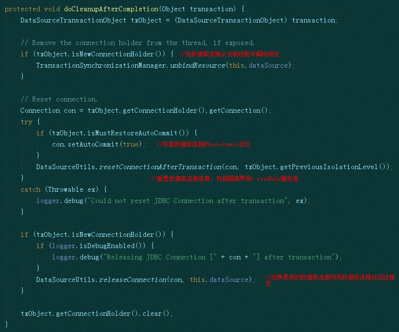 如果事务执行前有事务挂起,那么当前事务执行结束后需要将挂起的事务恢复,挂起事务时保存了原事务信息,重置了当前事务信息,所以恢复操作就是将当前的事务信息设置为之前保存的原事务信息。到这里事务的回滚操作就结束了,下面让我们来看事务的提交操作: