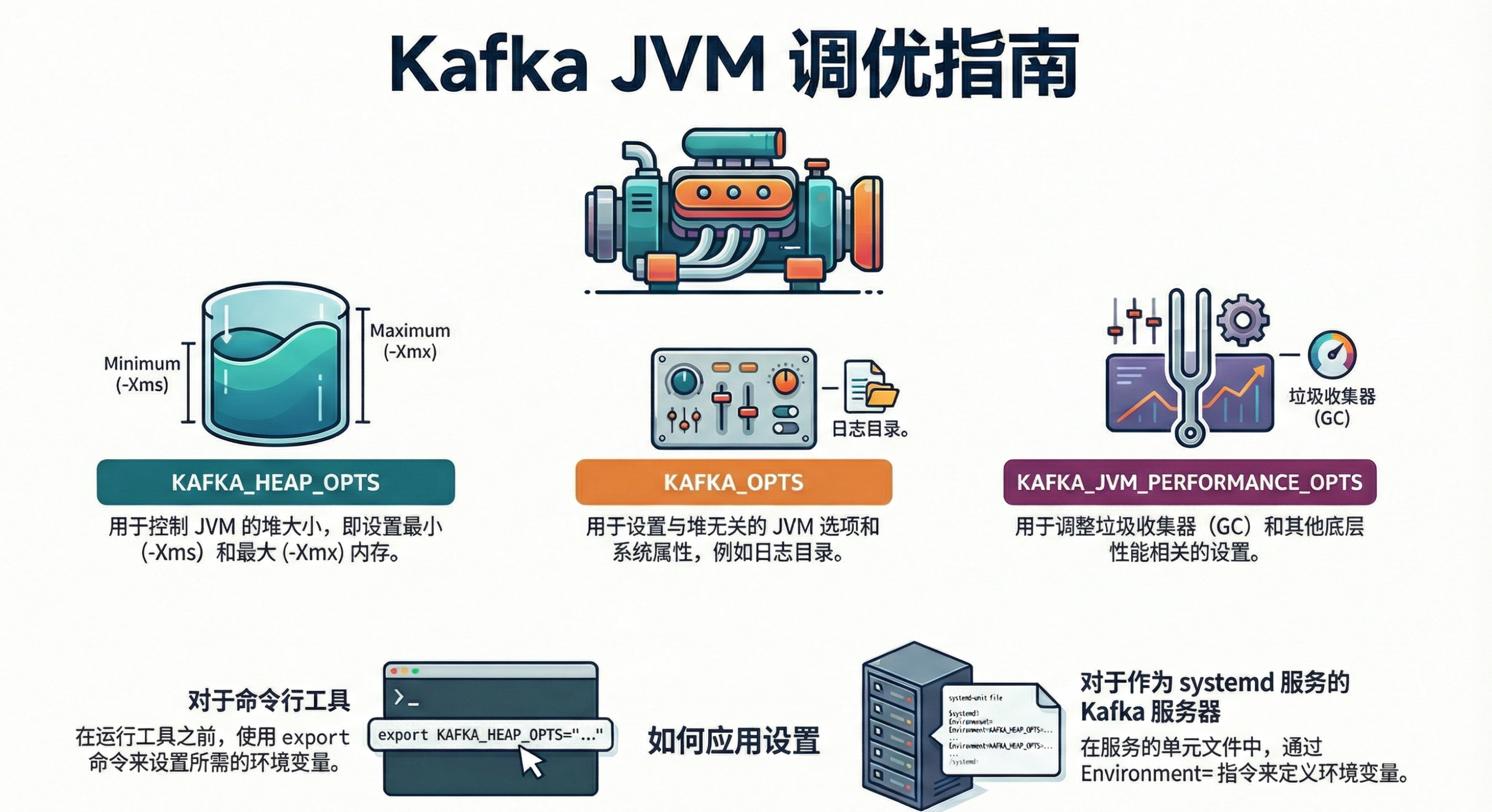 本文将详细介绍三个核心环境变量,它们是配置 Kafka JVM 选项的关键: